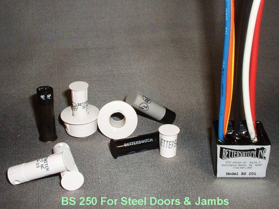 BS-250 STEEL DOOR 3/4" HOLE NEEDED FOR SPACER 1 pair stranded 18 AWG. Class 2 rated insulation jacket wire needed to connect reed switch to power controller. Power Rating: 10 AMP @ 120 VAC/60 Hz - RESISTIVE LOAD ONLY! AVAILABLE COLORS: WHITE, BROWN AND BLACK. BS-151 EXTRA FLUSH MOUNT SWITCH, MAGNET and 2 SPACERS ONLY. (for use with BS-250)